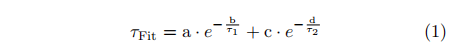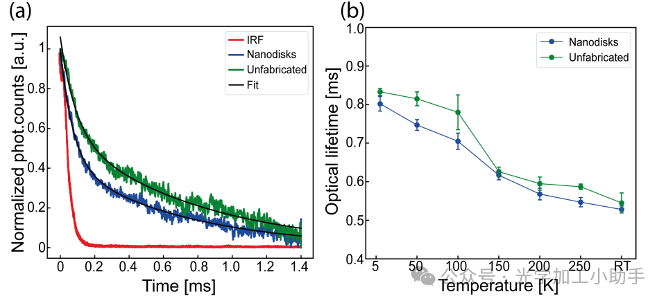 我们测量了Er-O缺陷的PL时间瞬态,以确定超表面和未加工SOI区域中的光学寿命。与Er相关的缺陷通常已知具有超过1毫秒的寿命,即使它们集成到光子器件中[35]。在本研究中,我们调制了应用的光学激发,将调制触发器与探测器输出同步,并使用1550 ± 50 nm带通滤光片隔离相关的发射(见方法和支持信息)。在此,仪器响应函数(IRF)以及从纳米盘阵列中的Er发射体和未加工样本部分获得的发射瞬态数据,均通过双指数函数进行拟合,公式如下: