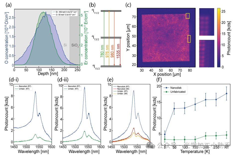 我们研究了在离子植入过程中通过350 keV的Er离子植入(剂量为4.0 × 10¹² Er/cm²)和50 keV的O离子植入(剂量为3.0 × 10¹³ O/cm²)形成的SOI超表面,在1:10(Er:O)比例下引入的Er-O缺陷[27–29]。图2(a)展示了这一过程。相关的能级示意图显示了Er3+的4I13/2 → 4I15/2跃迁。由于偏离共振激发,我们还激发了4I11/2 → 4I15/2跃迁。