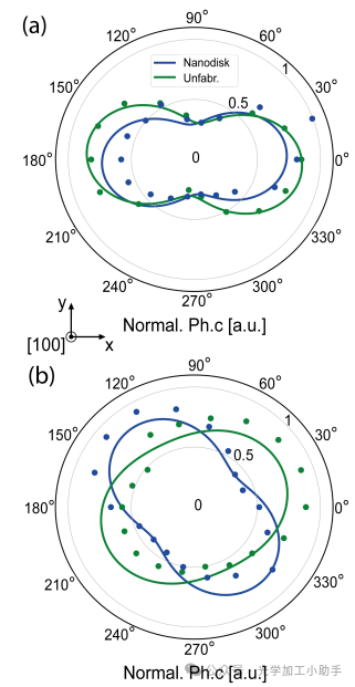 此外,我们通过旋转1550 nm的半波片(HWP)并结合全偏振片(FP)研究样品未加工部分中的Er-O缺陷的发射特性,发现了未偏振的偶极行为,同时将激发部分设置为相应的最大值,如图4(b)所示。在这项研究中,1550 ± 50 nm带通滤光片(BP)用于隔离相关的发射。可以识别出发射偏振可见度 ηEm., Unfabr. 为30.2%。有趣的是,在另一种研究情况下,可以确定发射偏振可见度 ηEm., Br.- Sym. 为38.2%。我们将这8%的发射偏振增加归因于纳米盘阵列的影响。这与之前提出的发现一致,其中光致发光增强图4.(a)Er-O缺陷的吸收偶极行为变化:通过旋转976 nm的半波片(HWP)并与全偏振器(FP)结合,在激发光束中测定吸收偏振行为。拟合数据使用了a、b和ϕ作为拟合参数。相应的吸收偏振可见度 ηAbs., Br.- Sym. ≈ 53.2% 和 ηAbs., Unfabr. ≈ 54.2% 分别计算得出。(b)Er-O缺陷的发射偏振行为:通过旋转1550 nm的半波片(HWP)并与全偏振片(FP)结合,在激发部分设置为最大值时测量发射偏振。通过分析数据,获得了发射偏振可见度 ηEm., Unfabr. 为30.2%,并且 ηEm., Br.- Sym. 为38.2%。这个8%的发射偏振增加归因于纳米盘阵列的影响。这与之前的发现一致,表明了光致发光的增强。图4. 观察到的Er3+缺陷的偏振特性:(a)观察到的光子吸收偶极行为。(b)观察到的光子发射特性,来自缺陷集合体。
