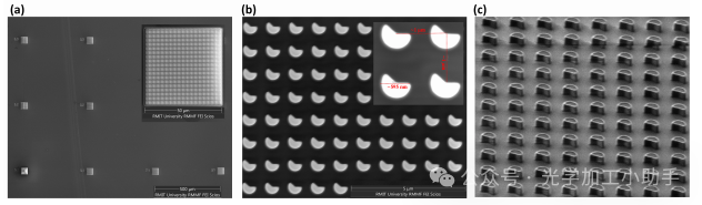 (a) 顶视图的扫描电子显微镜(SEM)图像,展示了制造的设备,图中显示了一组50 × 50 µm²的方形超表面元素。插图提供了其中一个方形超表面元素的放大视图,揭示了其详细结构。