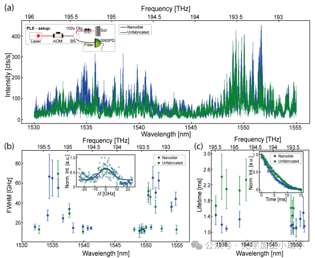 在常温下,光致发光激发光谱(PLE)实验在自由空间配置下进行。使用可调激光(Cobrite DX100),波长范围从192.7924 THz到195.9439 THz(1530 nm和1555 nm),通过声光调制器调制后,利用奥林巴斯100X目标物(LC-Plan N 100x 0.85 NA)进行激发光的施加,并以500 MHz的增量进行,随后使用SNSPD捕获光子事件。在激发过程中,SNSPD的偏置电流设置为零,并在与激发信号下降沿相重合的时间区间恢复有效值。激发信号的下降沿被同时检测并时间戳(ID Quantique ID801),作为触发事件。随后,记录光子事件的时间戳。通过后处理,我们移除所有在下降沿触发前的时间戳光子事件,并能够提取每个脉冲激发后1 ms的检测到的光子数。共振光学寿命瞬态通过首先在PLE光谱中通过单一高斯拟合识别不均匀共振来获得。随后,激发被配置以驱动确定的共振峰,随后进行瞬态采集,最终通过双指数拟合得到光学寿命。