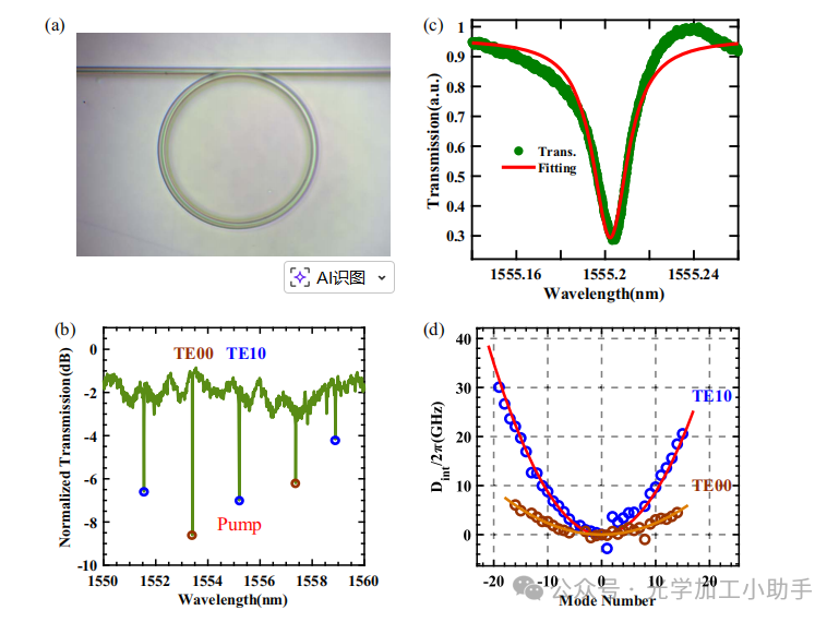 (d) 空心圆表示在1553.4 nm(TE00模式)和1555.2 nm(TE10模式)中心模式下测量的两种模式的集成色散(Dint/2π)。实线是色散的二次拟合线。拟合的D2/2π分别为46.8 MHz(TE00)和174.9 MHz(TE10)。