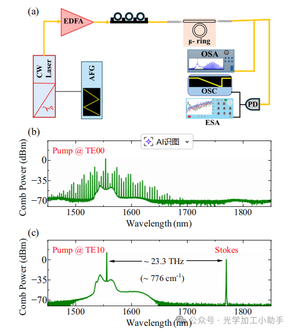 (d) TE10模式与TE00模式之间的相位匹配配置。TE00模式为红色,TE10模式为蓝色。高斯分布表示约120 GHz的拉曼增益宽度。图2(a)展示了实验 setup。一个可调的连续波(CW)二极管激光器作为泵浦源,由任意函数发生器(AFG)控制。光通过掺铒光纤放大器(EDFA)放大,并使用光纤偏振控制器调整偏振后耦合到共振腔中。光通过一对带透镜的光纤耦合进出芯片。输出通过光谱分析仪(OSA)进行分析,并通过光二极管(PD)监测,以评估生成的微梳的相干性,使用示波器(OSC)和电光谱分析仪(ESA)进行监测。泵浦激光频率从共振的蓝移侧调谐到共振腔模式。图2(b)和图2(c)分别展示了泵浦基模1553.4 nm和高阶模式1555.2 nm时的光谱,片上功率为270 mW。