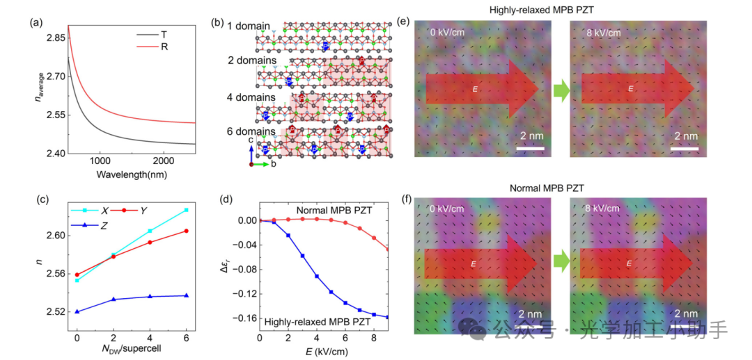 因此,相的变化显著改变了折射率并增强了电光效应。接下来,为了确定畴壁浓度变化对折射率的影响,我们以180°畴壁为例,这使得我们能够在模型中轻松构建并保持稳定。通过结构松弛,构建了一个1 × 12 × 1的超级晶胞,包含四种不同的极化状态——单畴、2个畴、4个畴和6个畴,分别对应每个超级晶胞的畴壁数(NDW/supercell)为0、2、4和6(图4(b))。如图4(c)所示,随着NDW/supercell的增加,沿X、Y和Z轴的折射率在780 nm波长下的值从10^-2增大。特别是在X轴和Y轴上观察到了显著的变化,而Z轴的变化较小。因此,对于具有单一(001)取向的薄膜,随着NDW/supercell的增加,Z轴的折射率仅发生轻微变化。然而,假设包含(001)和(100)两种取向的混合取向具有更大的折射率,并可能具有更显著的Δn,这使得所制备的PZT薄膜中较大的电光系数是合理的。值得注意的是,与正常畴极化切换下单晶PZT的Δn(约10^-4)[16]相比,由相变(约10^-1)和畴壁变化(约10^-2)引起的Δn大约大两个数量级,突出了电光系数的有效增强。