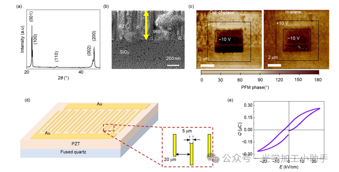 (d) 测量电极的示意图,用于面内极化滞回曲线的测量。一个并行的指状电极,电极间距为20 μm,单个电极宽度为5 μm,沉积在PZT薄膜表面。