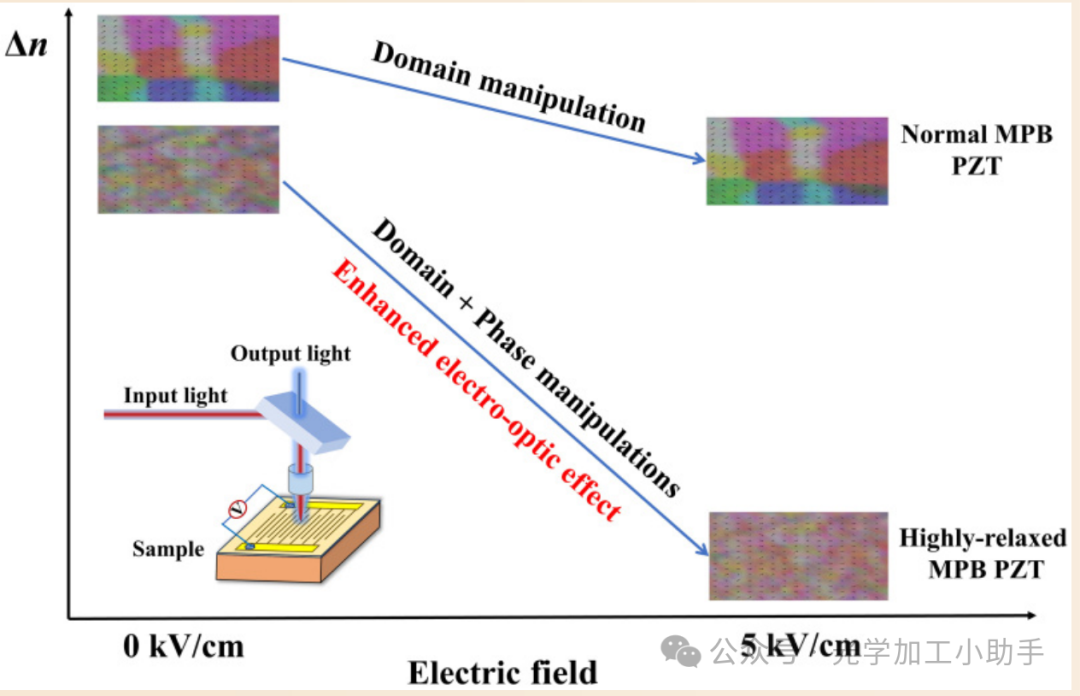 尽管在铁电材料中获得了不同的电光系数,但至今尚未有明确的机制来解释高电光系数。电光效应是外部电场、光场和电极化的耦合作用,其中电光系数主要受电子、离子或晶格极化以及反向压电效应的影响[22]。多尺度组分的结合和光电耦合的复杂性使得电光机制的研究充满挑战。从结构的角度来看,相、畴结构和畴壁等因素在影响极化和折射率上起着关键作用[29,46,47]。因此,了解这些结构元素在面内电场下的演变行为及Δn,对于阐明极化与电光效应之间的关系至关重要。
