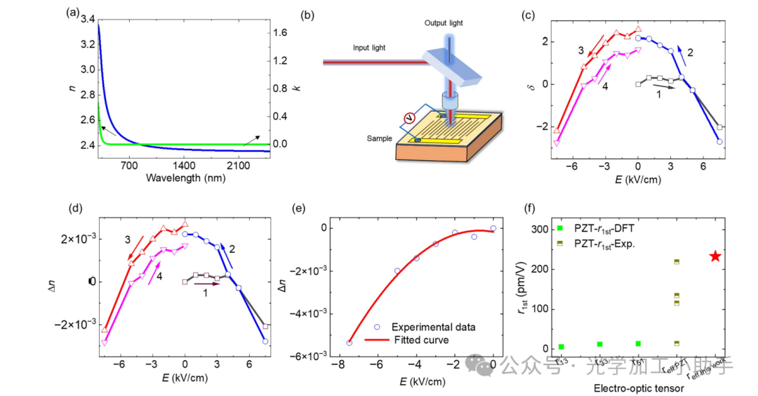 低面内矫顽场表明所制备的PZT薄膜具有较低的极化反转障碍,这有利于介电调节性和电光调制。我们首先分析了薄膜的折射率n和消光系数k(图2(a))。随着波长从780 nm增加到1550 nm,n值从2.40逐渐降低到2.37,而k值从5×10−5降到远低于1×10−6。较小的k值有利于提高透光率和电光调制性。我们采用了基于斯托克斯矢量的定制电光表征系统(图2(b),反射模式)[45],通过电极引导的有线样品测量不同施加直流电场下的相位差δ(见电子补充材料中的图S4和S5)。使用厚度约为0.5 mm的LiNbO3单晶板来校准系统,得到了约29.8 pm/V的电光系数(通过施加与<0001>方向平行的直流电场,见电子补充材料中的图S6),这一值与报告的值(约31 pm/V)一致[4],验证了系统的稳定性和准确性。获得了典型的相位差滞回曲线,与极化滞回曲线一致(图2(c))。折射率变化(Δn)作为施加电场(E)的函数,按照斯托克斯矢量推导,封装了光的相位信息(见电子补充材料第二部分)。电场依赖的Δn表现出典型的滞回行为(图2(d))。通过对Δn与E的关系进行分段多项式拟合,确定了第一阶Pockels和第二阶Kerr电光系数(r1st,r2nd)(图2(e))。该分析建立了折射率变化(∆n)与电场(E)之间的功能关系。计算得到的r1st和r2nd值分别为约233.5 pm/V和约16.3×10^−16 m²/V²。