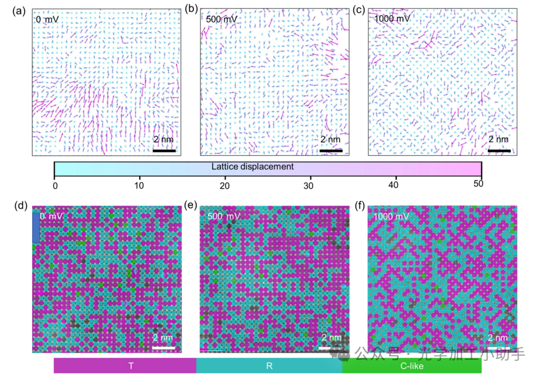 在本研究中,使用原位高角环形暗场扫描透射电子显微镜(HAADF-STEM)图像研究了畴和相结构的演变。图3(a)至图3(c)分别显示了在0、500和1000 mV面内电压下测得的面内离子位移。从极化映射中可以明显看到纳米尺度的畴,甚至有几个单位胞大小的极性纳米簇。纳米尺度的畴表现出无序的极化方向。然而,某些区域没有明显的离子位移,这些区域的极性矢量可能延伸到平面外,表明畴结构的随机分布。对于新样品(图3(d)),所制备的PZT具有T相(紫色)和R相(蓝色)的混合结构。绿色区域虽然不代表立方相,但在二维投影中没有大小,因此便于称其为立方似(C-like)相。类似的C-like相也在松弛型铁电陶瓷中报道过,这些材料表现出低各向异性和随机的畴取向[48]。在零电场下,T、R和C-like相的比例约为50% : 48% : 2%。所制备的低各向异性PZT表现出纳米尺度的畴和纳米簇,表明其处于高度放松的状态,内部应力减少,纳米尺度的畴分布更加均匀。该结构与典型的外延或溶胶-凝胶法制备的MPB PZT薄膜有所不同,后者受夹紧效应的限制,二维投影中清晰可见不同的R和T相[49,50]。随着电场的增加,在所研究的PZT表面没有观察到明显的畴结构成核或生长。在500 mV(2.5 kV/cm)时,畴的大小和相分布明显发生变化。在1000 mV(5.0 kV/cm)时,纳米畴的极化方向继续演变,颜色分布发生了可见变化,对应于R、T和C-like相结构。与0和500 mV下的情况相比,观察到的较大颜色模式普遍减少,这表明畴的极化切换和相演变,随后是畴壁的变化。该相演变过程所涉及的应变进一步通过原位XRD结果得到验证,其中衍射峰(001)和(100)的2θ值在电场循环下经历滞回应变变化(见电子补充材料中的图S7)。因此,由于高度放松的PZT所驱动的相演变、畴切换和畴壁变化,显著释放了极化自由度,以实现大幅折射率调制,这预计将有助于提高电光系数。