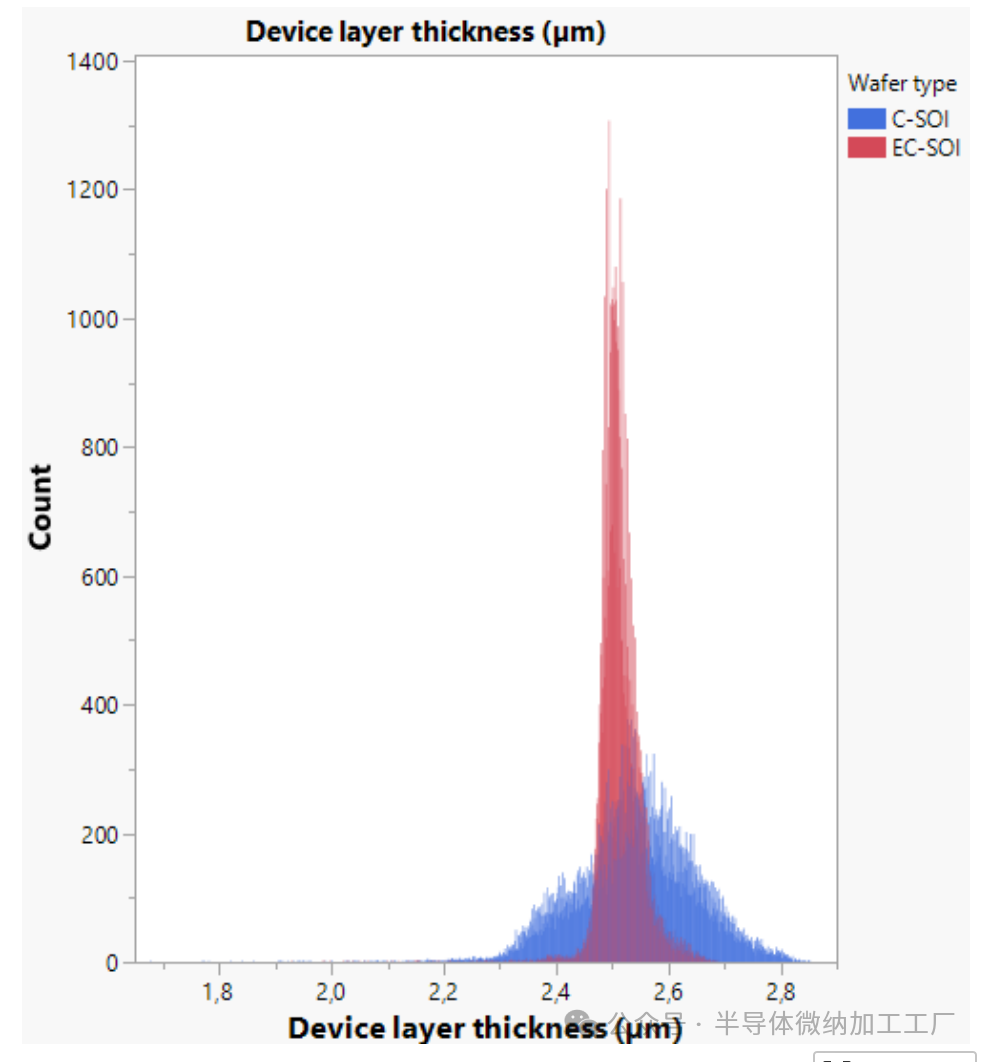 图4. C-SOI和EC-SOI晶圆上器件层厚度的分布