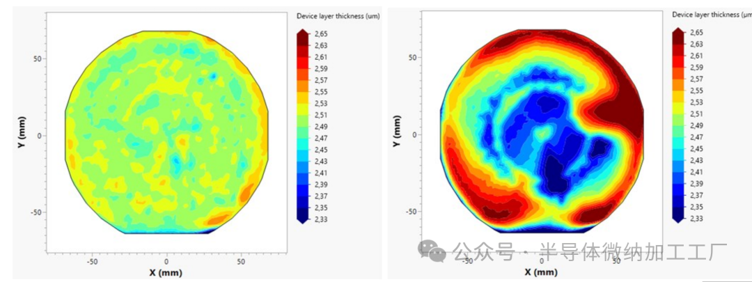 图3. (左)图像显示了单个EC-SOI晶圆的器件层厚度均匀性。(右)图像显示了单个C-SOI晶圆的类似数据。