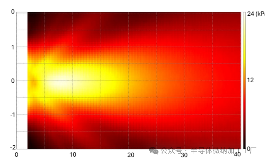 图8. PMUT产生的压力场(XZ轴)。驱动信号为3.5 V,7.4 MHz,4个周期。