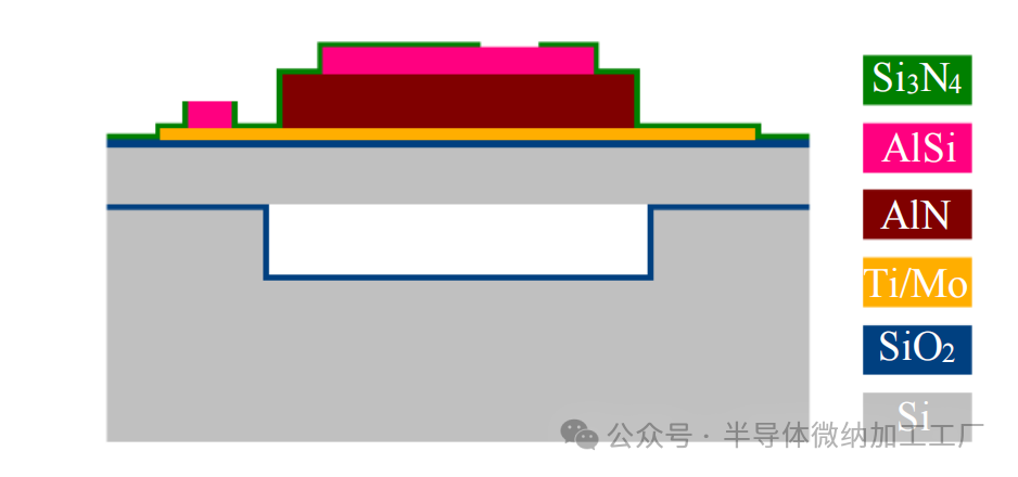 已设计出一种工作频率约为7 MHz(在水中为9.5 MHz)的PMUT阵列。图1显示了PMUT单元的横截面。