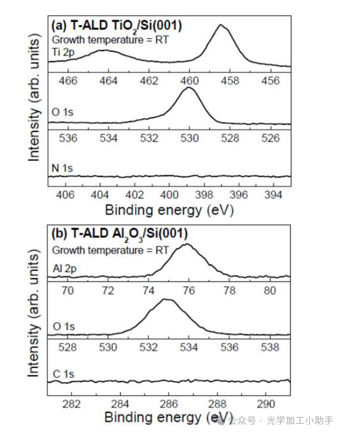 使用 XRD 检查了使用 T-ALD 在室温下生长的Ti02、 Al203和Zno 薄膜的结晶度。此处,Ti02和AI203薄膜显示出不存在任何显着的衍射特征,表明其具有类非晶结构(数据未显示),这与之前的报道非常吻合[10,21]。与两者相比如图。7.(a) Ti02(Ti2p、01s 和 N)的 XPS 光谱1s)和(b)Al203(Al2p、0 1s 和 C 1s)在室温下生长使用 T-ALD 测量温度。