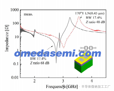 图 3 使用 ZX 铌酸锂(LN)薄板制成的 5.8 GHz 高频 A1 模式兰姆波谐振器。