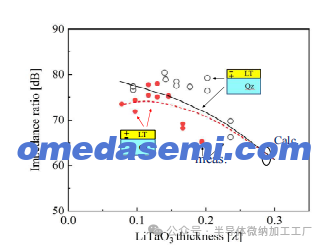 图 15 和图 16 分别展示了高铝含量声表面波谐振器根据钽酸锂归一化厚度计算得出的模拟带宽、阻抗比以及实测的带宽、阻抗比。需要注意的是,归一化的铝厚度会因波长不同而有所变化。白色圆圈和红色圆圈分别代表–LT + / Qz 和 + LT – / Qz 的实测数据。黑色实线和红色虚线分别展示了–LT + / Qz 和 + LT – / Qz 的模拟带宽和阻抗比。它们是在铝厚度恒定为 0.4μm 的情况下计算得出的,所以每个经波长归一化的铝厚度是不同的,但它们呈现出相同的趋势。数据显示出一些离散性,这可能是由于钽酸锂的差异以及制作工艺的不完善所致。然而,尽管实测的平均带宽和阻抗比与模拟值有所不同,但实测的带宽和阻抗比总体上与模拟值相符。在钽酸锂厚度为 0.1 - 0.15λ 时,实测结果表明,与 + LT – / Qz 相比,–LT + / Qz 的带宽宽约 5 - 11%,阻抗比高 3 - 6dB [25]。