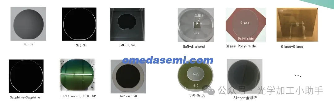 GaAs-SiC,InP-Diamond, LN-SiC,Si-Si,GaN-Dlamond,Sl-Diamond,蓝宝石-蓝宝石,金刚石-sic, sic-inp,sic-LN, ic-ga2o3,glass--glass,Si-SiC,Si-GaAs、GaAs- SiC、Si–SiC、SiC–SiC、Ge–Ge 、Al 2 O 3 -Al 2 O 3 ,GaP-InP, GaN-Si、LiNbO 3 -Al 2 O 3 、LiTaO 3 -Si and more(晶体,陶瓷,等等)