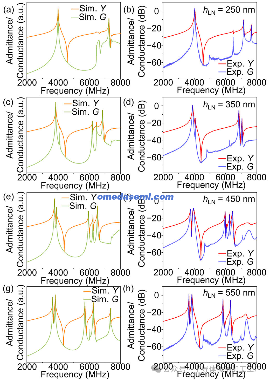 图4. (a)(110)晶面的X射线衍射(XRD)摇摆曲线和(b)X - LN薄膜的原子力显微镜(AFM)图像。(c)4H - SiC衬底上X - LN薄膜的横截面透射电子显微镜(TEM)图像和(d)高分辨率透射电子显微镜(HRTEM)图像。图5. (a)和(b)波长(λ)= 1.2微米且倾斜角(β)= 24°的谐振器的光学显微镜图像。(c)和(d)波长(λ)= 1.0微米且倾斜角(β)= 24°的谐振器在不同放大倍数下的扫描电子显微镜(SEM)图像。A. 异质结构材料的制造与分析 关于异质结构材料的制备,采用表面活化键合(SAB)方法将一片4英寸的单晶X - LN薄膜转移到4英寸的4H - SiC衬底上[51]、[52],4英寸的单晶X - LN晶片和4英寸的高绝缘4H - SiC晶片均可在市场上购得。更具体地说,首先通过离子束轰击对X - LN块状晶片和4H - SiC晶片的表面进行活化处理。然后,将这两个活化后的表面在无额外负载和加热的情况下直接键合在一起。最后,通过研磨工艺将X - LN薄膜减薄至接近目标厚度,再利用化学机械抛光(CMP)进行抛光,以获得光滑表面并精细调整铌酸锂(LN)的厚度。 为详细了解这种异质结构的特性,还对具有不同hLN值(包括250、350、450和550纳米)的X - LN/SiC衬底进行了研究。 hLN = 350纳米的双层衬底的典型材料特性如图4所示。图4(a)展示了通过高分辨率X射线衍射(HRXRD)测试的X - LN(110)晶面(x平面)的摇摆曲线。X - LN薄膜的半峰全宽(FWHM)为136弧秒,这证明了其高单晶质量。如图4(b)所示,通过原子力显微镜(AFM)表征可知,X - LN薄膜的均方根表面粗糙度(RMS)为0.281纳米。较低的均方根表面粗糙度表明X - LN薄膜表面非常光滑,因此可以在其上构建叉指换能器(IDT)。双层衬底横截面的透射电子显微镜(TEM)图像如图4(c)所示。X - LN薄膜上的铂(Pt)层用作粘结剂,有助于制备透射电子显微镜(TEM)样品。铌酸锂(LN)薄膜的厚度与预设值相符,并且X - LN与SiC之间的界面笔直清晰,无孔洞和裂纹。如图4(d)所示,界面的高分辨率透射电子显微镜(HRTEM)图像展示了更多细节,X - LN和SiC清晰的晶格条纹进一步证实了它们的高质量晶体特性。此外,在键合界面处可以观察到一层厚度约为6纳米的非晶层,这是表面活化键合(SAB)技术的常见现象[52]、[53]。图6. 波长(λ)= 1.2微米、铌酸锂(LN)厚度(hLN)= 250纳米且倾斜角(β)不同的倾斜叉指换能器(tilted-IDT)谐振器的实测导纳和电导曲线:(a)0°,(b)4°,(c)8°,(d)12°,(e)16°,(f)20°,(g)24°。(h)不同倾斜角下的实测史密斯圆图。图7. (a)波长(λ)= 1.2微米且铌酸锂(LN)厚度(hLN)= 250纳米的余弦加权谐振器的实测导纳和电导曲线。(b)具有不同叉指换能器(IDT)配置的谐振器的波特Q值结果。(c)具有不同叉指换能器(IDT)配置的实测史密斯圆图。图8. 波长(λ)= 1微米且铌酸锂(LN)厚度不同的谐振器的模拟及实测导纳和电导曲线:(a)和(b)hLN = 250纳米,(c)和(d)hLN = 350纳米,(e)和(f)hLN = 450纳米,以及(g)和(h)hLN = 550纳米。图9. (a)不同波长谐振器的实验导纳曲线。不同波长谐振器水平剪切(SH)模式的相速度(Vp)(b)和机电耦合系数(K²)(c)的计算(线)与测量(点)结果。上述谐振器的实验(d)温度系数(TCFa)和(e)最大品质因数(Qmax)值。 设计并制造了不同波长和倾斜角的谐振器。电极材料为铝,其厚度设定为80纳米。叉指换能器(IDT)图案通过标准光刻技术形成,而电极则通过电子束蒸发和剥离工艺制造。图5展示了波长(λ)= 1.2微米且倾斜角(β)= 24°的谐振器的光学显微镜图像,以及波长(λ)= 1.0微米且倾斜角(β)= 24°的谐振器的扫描电子显微镜(SEM)图像。规则排列的电极指形状良好,这证实了它们制造精良。对于所有谐振器,叉指换能器(IDT)孔径设定为30λ。电极指数量(Ni)和反射指数量(Nr)分别为200和20。 为了探究倾斜角β对横向模式抑制的影响,设计并制造了不同倾斜角的谐振器,其导纳和电导响应如图6(a) - (g)所示。这里,谐振器是在铌酸锂(LN)厚度(hLN)= 250纳米的X - LN/SiC上制备的。这些谐振器通过地 - 信号 - 地(G - S - G)探头和安捷伦E5071C矢量网络分析仪进行测量,信号与地探头之间的距离为150微米。当β = 0°,即采用常规叉指换能器(IDT)时,谐振器对横向模式缺乏抑制作用。随着β的增大,通带内的横向模式逐渐受到抑制。在史密斯圆图上绘制的阻抗曲线中也能观察到类似结果,如图6(h)所示。代表杂散模式的波纹随着β的增大而逐渐消失。当β = 24°时,低阶横向模式被成功消除,高阶横向模式几乎不可见。因此,24°是抑制横向模式的最佳倾斜角,这对设计无杂散且低损耗的滤波器具有指导意义。在接下来的内容中,如果没有特别说明,倾斜叉指换能器(tilted IDTs)特指β = 24°的倾斜叉指换能器。 作为一种常见的变迹方法,余弦加权叉指换能器(IDT)在抑制横向模式方面应用广泛[47]、[54]。图7(a)展示了波长(λ)= 1.2微米且铌酸锂(LN)厚度(hLN)= 250纳米的余弦加权谐振器的传输响应,与倾斜(24°)谐振器相比,它在抑制高阶横向模式方面表现略好,因为电导曲线中高阶横向模式产生的尖峰几乎不可见。进一步研究了不同叉指换能器(IDT)配置的波特Q值结果,如图7(b)所示。在此,波特Q值通过以下公式计算[55]: \(Q=\frac{\omega|S_{11}|\tau_{G}}{1 - |S_{11}|^{2}}\) (3) 其中,\(\omega\)是角频率,\(\tau_{G}\)和\(|S_{11}|\)分别是群延迟和反射系数\(S_{11}\)的幅值。在这方面,采用常规、余弦加权和倾斜(24°)叉指换能器(IDT)的谐振器的直接读出最大波特Q值(\(Q_{max}\))分别为714、486和591。具有明显横向模式的常规谐振器的波特Q值比其他两种配置的要高,因为变迹和倾斜换能器方法都会削