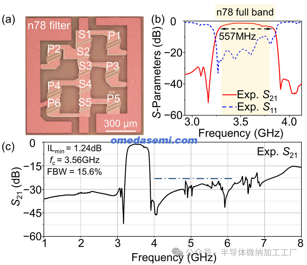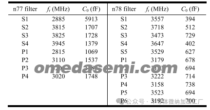 图10. 分别对应(a)和(b)波长(λ)= 1.2微米以及(c)和(d)波长(λ)= 2.0微米的谐振器的修正巴特沃斯 - 范戴克(mBVD)拟合及实测相位和导纳曲线以及波特Q值结果。插图描绘了mBVD模型。图11. 针对(a)n77频段和(b)n78频段的滤波器的模拟S参数。图12. (a)n77滤波器的光学图像和(b)实测S参数。 (c)n77滤波器在较宽频率范围内实测的S21曲线。图13. (a)n78滤波器的光学图像和(b)实测的S参数。 (c)n78滤波器在较宽频率范围内实测的S21曲线。 基于上述系统性研究,对采用铌酸锂(LN)厚度(hLN)= 250纳米的X - LN/SiC异质结构的n77和n78频段滤波器进行了理论设计,其模拟S参数如图11所示。模拟结果显示出良好的通带平坦度以及陡峭的带外衰减特性。 在模拟设计参数的指导下,成功制备出了相应的n77和n78滤波器,展现出了足够的带宽和基本平坦的通带,如图12和图13所示。构成n77和n78滤波器的谐振器的谐振及电容参数列于表II。n77和n78滤波器的光学图像分别如图12(a)和图13(a)所示,其组成的谐振器倾斜了24°以抑制横向模式。n77滤波器由四个串联谐振器和四个并联谐振器组成,n78滤波器由五个串联谐振器和六个并联谐振器组成。 图12(b)展示了n77滤波器实测S参数的特性。实测的S21曲线与图11(a)所示的模拟曲线在定性上相似,这表明模拟过程相当可靠。S11曲线显示整个通带内的回波损耗大于15分贝。图12(c)绘制了n77滤波器在较宽频率范围内实测的S21曲线。n77滤波器的中心频率(fc)为3763兆赫兹,其3分贝分数带宽(FBW)达到24.8%。同时,该滤波器在低频侧表现出1.53分贝的较小最小插入损耗(ILmin)和18.7分贝的良好带外抑制特性。此外,如图12(c)所示,由于对hLN/λ的恰当选择,在4.5 - 8吉赫兹的频率范围内高阶模式得到了很好的抑制,这有利于减少高频载波聚合(CA)频段的不利损耗。 如图13(b)所示,n78滤波器的S11曲线显示在中心频率(fc)处的回波损耗约为19分贝。n78滤波器的中心频率(fc)和3分贝分数带宽(FBW)分别为3560兆赫兹和15.6%,其最小插入损耗(ILmin)为1.24分贝。n78滤波器响应的宽频图像展示了28.1分贝的出色带外抑制特性、陡峭的抑制斜率以及对高阶模式的良好抑制效果。 本工作中的滤波器能够完美覆盖5G n77和n78频段,具有适中的通带平坦度和低损耗,这证明了声表面波(SAW)技术在制造高性能、宽带5G滤波器方面的可行性。 对这两个滤波器的温度漂移特性进行了测量,结果如图14所示。如图14(a)和(c)所示,对于这两个滤波器,随着温度升高,S21曲线向低频方向移动,这表明它们具有负的频率温度系数(TCF)。图14(b)和(d)绘制了它们在不同温度下的中心频率(fc),并从线性拟合曲线中提取出中心频率的频率温度系数(TCFc)。n77和n78滤波器的中心频率频率温度系数(TCFc)分别为 - 57.7 ppm/°C和 - 54.1 ppm/°C,这比基于块状铌酸锂(LN)晶片的滤波器的频率温度系数(TCF)值(约 - 80 ppm/°C)要小,原因是碳化硅(SiC)衬底较低的热膨胀系数(TEC)抵消了铌酸锂(LN)晶片较大的热膨胀系数(TEC)。表二 构成N77和N78滤波器的谐振器的谐振及电容参数图14. (a)和(c)n77和n78滤波器在不同温度下实测的S21曲线,以及(b)和(d)相应的中心频率(fc)变化及其线性拟合曲线。表三 最先进的水平剪切声表面波(SH - SAW)谐振器的对比