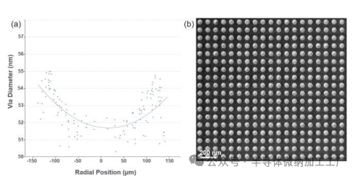 混合键合所需的关键V1图案使用负调光掩膜和光刻胶进行打印,以达到50nm通孔关键直径(CD)目标。