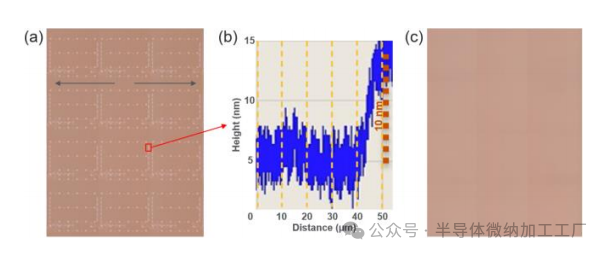 图1a展示了一个3x4芯片阵列的光学图像,可以看到铜空白区以及未中断的铜通孔图案的水平通道。通过轮廓仪测得,从密集的铜图案到氧化物区的台阶高度为10nm [图1b]。这一高度变化的距离大约为10 µm,导致了1 nm/µm的坡度,超过了无空洞混合键合的阈值。这些较大的表面形貌变化及其不均匀的径向分布将严重影响键合波传播的控制和对齐精度 [1-6]。因此,设计进行了优化,减少了铜空白区,并将剩余的区域对称分布在芯片周围。更新后的3x4芯片阵列如图1c所示。