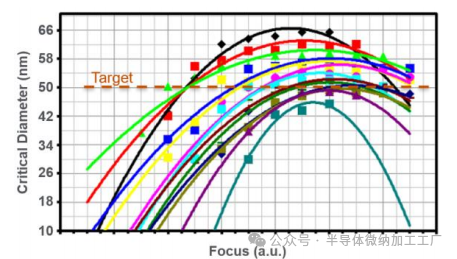 图3. Bossung曲线,用于确定50nm CD目标的曝光剂量/焦点窗口。不同颜色的曲线代表不同的曝光剂量。