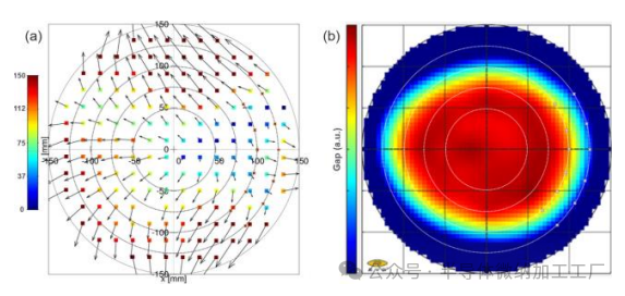 这种重复性台阶高度不均匀性的影响可以在初步键合后的通孔层测试晶圆中看到 [图2a]。唯一具有可接受(<40nm)对齐误差的区域是在晶圆的右侧,沿着X轴中心线。这与收集到的键合波传播数据一致 [图2b],该数据展示了一个对称的波前从晶圆中心向外传播,沿着X轴中心线的区域。由于台阶高度空白通道是水平的,因此键合波在X方向的传播速度较快,而在Y方向传播较慢。这种不对称的传播导致了晶圆其他三个象限中的极端对齐误差(>100nm)。
