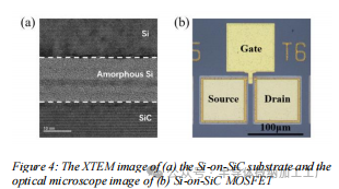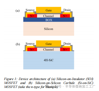 图1展示了Si-on-SiC器件和SOI器件架构的示意图。在Si-on-SiC架构中,顶部的硅层用于器件的制造,而SiC基板则可作为绝缘层,因其具有宽带隙,并且由于其优异的热导率,也可用作散热器。: (a)硅绝缘体(SOI)MOSFET的器件架构;(b)硅基碳化硅(Si-on-SiC)MOSFET的器件架构(以n型为例)。