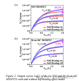 为了便于对SOI和Si-on-SiC器件架构之间的差异进行比较分析,本文进行了这两种MOSFET器件的TCAD仿真。为了实现自加热仿真,MOSFET器件设置了相应的热模型。两种MOSFET的器件参数相同,并且使用相同的物理模型进行仿真,同时基板连接到散热器。TCAD仿真结果如图2和图3所示。图2: (a)SOI和(b)Si-on-SiC MOSFET的输出特性曲线ID-VD,分别包含和不包含自加热效应模型。输出特性曲线ID-VD