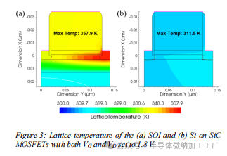图3: (a)SOI和(b)Si-on-SiC MOSFET的晶格温度,VG和VD均设置为1.8 V。此外,图3(a)中可以明显看到SOI的BOX两侧的温差,表明BOX确实阻碍了从通道向基板散热的过程。相反,SiC基板表现出相对较小的温差,这可归因于SiC材料的高热导率。