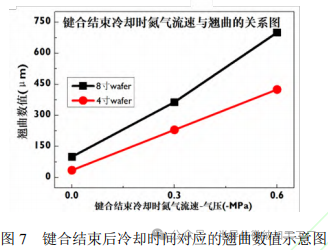 冷却时间与翘曲。键合结束氮气气压数值与翘曲数值呈正相关,是除 CTE 失配外产生翘曲最大的工艺制程。气压的主要作用是冷却键合对,使之从目标键合温度降低温度(120 ℃)直至取出样品。氮气冷却气压数值越大,冷却速度越快,所获得键合对的翘曲越大。相反,调低氮气压或者关闭氮气冷却可以获得低翘曲的临时键合对。本次实验采用 0.6 MPa 的冷却气压,结束键合后温度从 200 ℃冷却到 120 ℃约 15 min,用时最短冷却速度最快,此时键合对翘曲数值接近700 μm,曝光机设备无法通过真空吸附晶圆,只能调低气压直至超出安全报警数值或者强行报废键合对。将冷却气压关闭 0 MPa,此时循环水冷却,冷却总时长为 60 min,此时冷却速度慢,样品翘曲数值很低,为 150~200 μm 左右,可达到客户使用需求。如图 7 所示,键合后降温冷却速率与翘曲的关系。