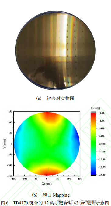 如图 6 所示,采用低 Bump 的 12 英寸 Live Wafer 和更匹配的衬底再次验证前文最优测试结果数据,得到了极低的翘曲数值 43 μm的临时键合对。成功验证了 TB4170 的最优临时键合条件。施加过大的压力可能导致晶圆过度压缩,从而在材料内部引入额外的应力,这些应力在冷却过程中会释放,引起晶圆形状的变化,进而增加翘曲度。此外,过大的压力还可能改变晶圆与键合材料之间的接触面积,导致应力分布不均,从而在键合过程中产生不均匀的形变。相反,施加过小的压力可能无法提供足够的粘附力来抵抗晶圆在键合和后续工艺过程中可能出现的各种应力,如热应力和机械应力。这种应力的不平衡分布可能会导致晶圆在冷却或储存过程中发生翘曲。适当的压力可以确保晶圆与键合材料之间的良好接触,同时避免引入额外的内部应力。