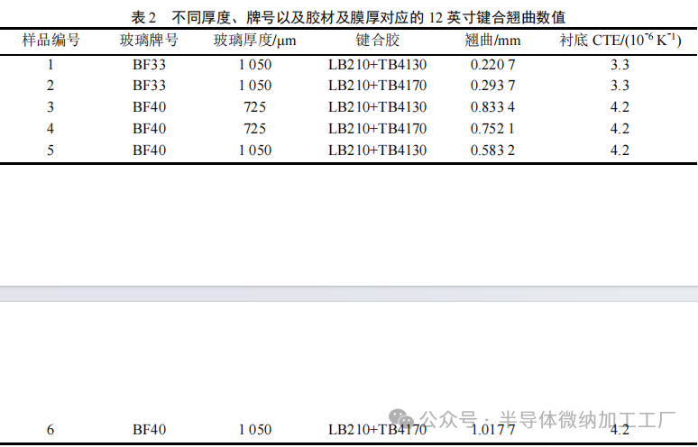 更换不同厚度的玻璃、选定相同的键合条件进一步验证相应键合翘曲度。表 2 结果显示,衬底 CTE 影响最大,对比样品 1 和样品 5,样品 2 和样品 6,即 BF33 玻璃和 BF40 玻璃对应的翘曲数据,发现相同胶材和衬底厚度情况下,BF33 玻璃仅仅占比在 0.38、0.29,CTE 显著影响翘曲。衬底厚度对比样品 3 和样品 5,样品 4 和样品 6 发现,翘曲比值分别是 1.40、0.74。同理,经过计算衬底厚度、胶材类型对翘曲数值影响,数值相差不大,没有明显规律。综上所述,衬底的 CTE 是影响键合对翘曲的关键因素,衬底厚度和键合胶种类影响相比较小。
