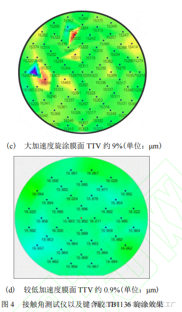 然而,这个结论尚未广泛地普及和应用到半导体产业中去。半导体产业内通用光刻胶的程序较多,一般光刻胶的润湿角<25°,与基底的润湿性很好,无法保持原有的水滴状,因此需要很大的旋涂加速度,一般是 10 000 r/min/s。该程序应用到临时键合胶时这种大加速度往往会破坏上述的水滴状微观形貌同时放大在滴加胶液出现的吸盘、晶圆、胶液三者圆心的同心度差异,导致胶面均一度变差。如图 4 所示,经过加速度调整后大接触角材料 TB1136 旋涂膜面 TTV 明显改善。因此,建议临时键合胶的加速度控制在 500 r/min/s 附近,旋涂时间可以控制在 30 s 左右。