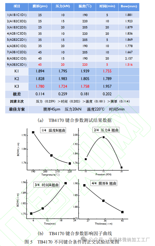 如图 5 所示,采用正交试验法对 TB4170 晶圆临时键合的膜厚、温度、压力、时间等进行了四因素三水平的实验测试与数据整理。通过对数据整理,得到了因素在不同水平下翘曲变化的趋势;因素之间影响力的排序;以及最优翘曲的键合条件和可调试的翘曲数值窗口。对 TB4170 而言,温度对翘曲呈负相关特性,180~200 ℃范围内,提高键合温度可助于提升材料流动性,较好的材料流动性可助于压平胶膜的 TTV 差异、弥补降温过程中衬底和晶圆 CTE 差值;键合时间与翘曲呈正相关,长时间高温压合粘弹体 TB4170 材料,向四周延伸较多,冷却过程材料向内部收缩,不利于翘曲数值减小。因素之间影响力排序为压力>时间>温度>膜厚。可调节范围为0.641 mm,占比为 29%。最优测试结果为压力 20 kN,时间 5 min,温度 220 ℃,膜厚 45 μm。