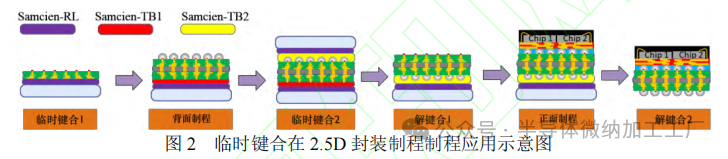 如图 2 所示,在 2.5D 集成电路封装中,临时键合技术至关重要,它为超薄晶圆提供必要的机械支撑,保护晶圆免受加工过程中的损伤。临时键合胶的使用允许晶圆在进行诸如研磨、蚀刻、CVD、金属化及塑封等背面工艺时保持平整和稳定,从而确保了工艺的精确性和器件的可靠性。