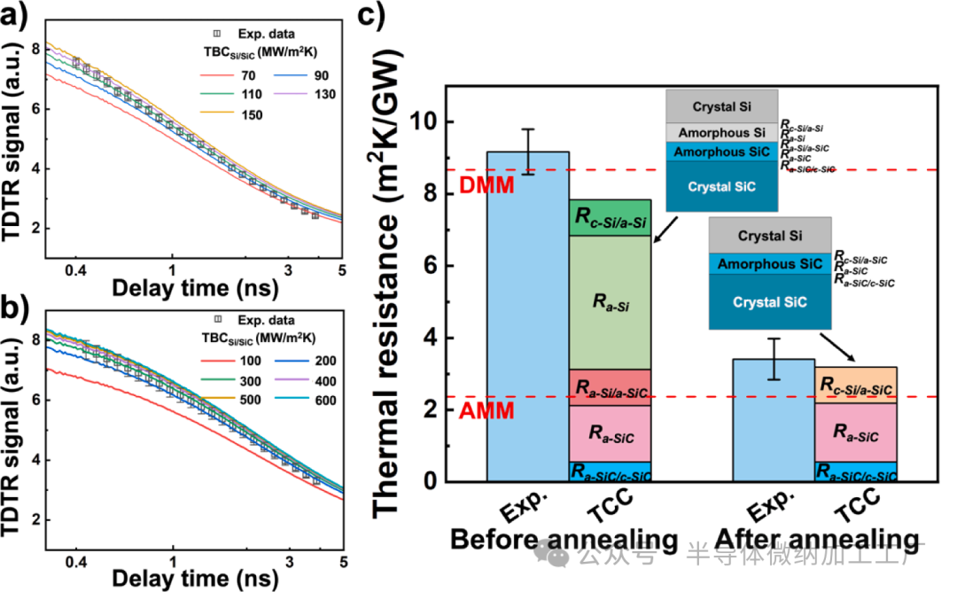 图3. TDTR 测量与分析。退火前的 TDTR 原始数据和拟合曲线 a) 以及退火后的 b)。误差条显示所有映射数据的标准差。c) 比较通过实验方法、AMM、DMM 和热电路计算 (TCC) 获得的 TBRSi/SiC。