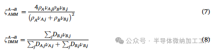 其中,ζ是声子传输系数,ℏ是约化普朗克常数,ν是群速度,n⊥是界面的单位法向量,D是声子态密度,f0是玻色–爱因斯坦分布函数,A和B下标表示两种材料。在AMM和DMM中,传输系数计算如下: