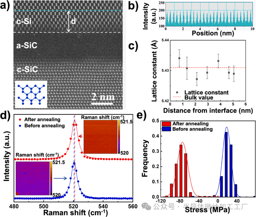 图2. Si器件层的应变/应力表征。a) 退火后键合界面的HRSTEM图像。插图显示了从[011]方向观察到的Si晶体结构。b) 沿图2a中绿色线的HAADF图像强度。c) 在距离界面不同位置(标记为“d”在图2a中)测量的晶格常数。d) 拉曼光谱。实线是通过洛伦兹分布得到的最佳拟合。虚线表示峰值位置。插图是60μm×60μm区域的拉曼峰位图。e) 通过拉曼峰位图计算的Si器件层应力分布。实线为正态分布拟合。