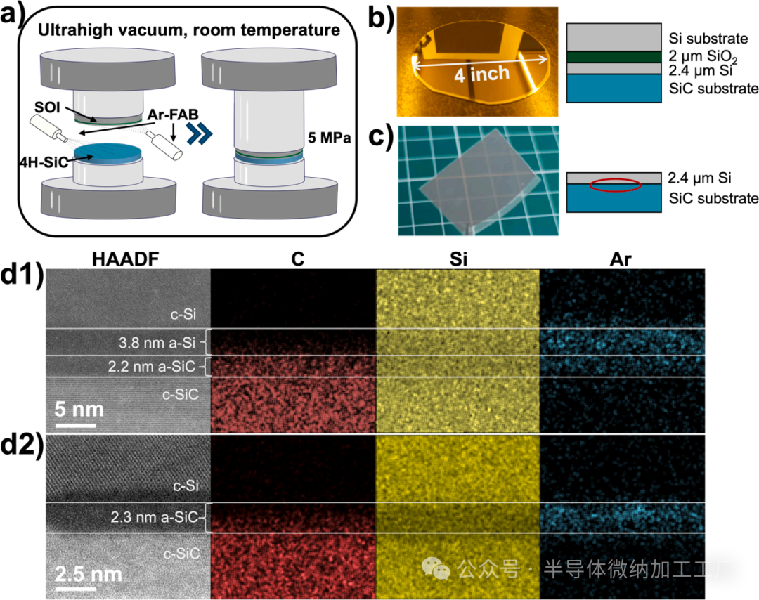 图1. 样品制备和界面结构表征。a) SAB过程示意图。b) 退火前4英寸SOI–SiC晶圆的光学图像和结构,c) Si-on-SiC芯片。红圈标记了目标Si–SiC界面。d) HRSTEM和EDS结果,显示退火前d1)和退火后d2)的SiC–Si键合界面。