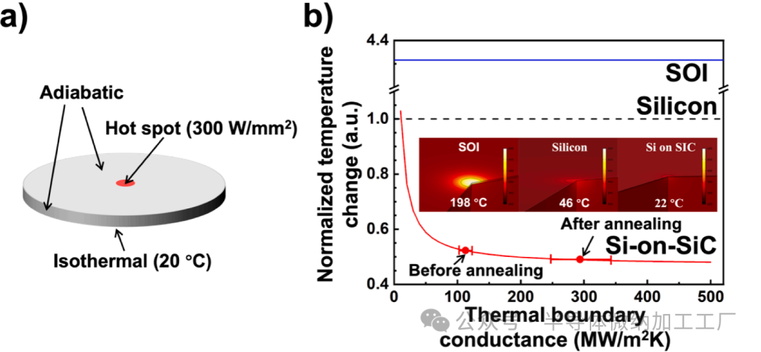 b) 使用FEM获得的具有不同TBC值和相同热点加热条件下的SOI、Si和Si-on-SiC晶圆的最大温度变化。以Si的最大温度变化值作为标准化参考。图中展示了我们样品退火前后的平均值和相应的空间分布,数据绘制在Si-on-SiC线条上。