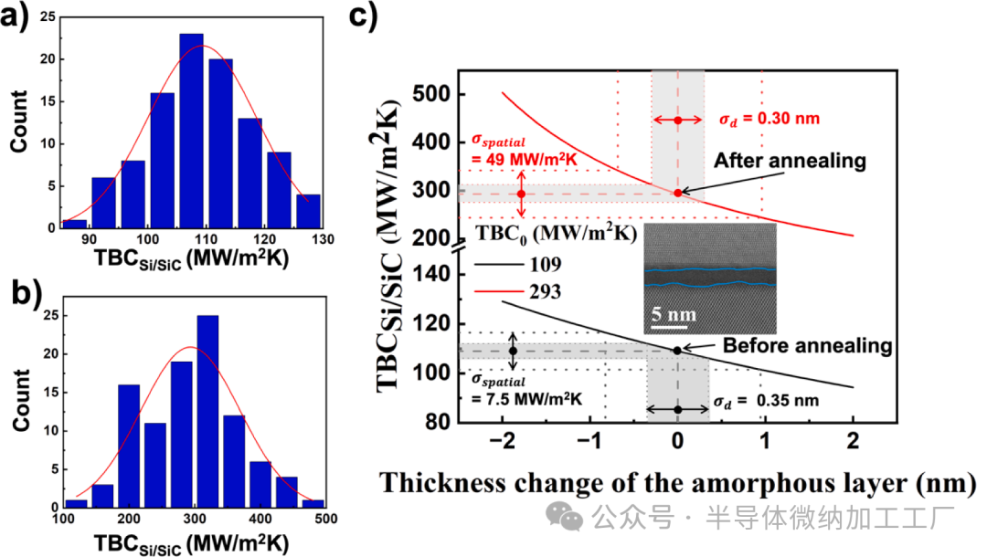 图4. TBC的空间分布分析。TBCSi/SiC映射结果,分别在退火前a)和退火后b)平均五次测量。红线表示高斯分布的最佳拟合。c) 无定形层厚度变化与TBCSi/SiC之间的关系,对于不同的TBC0(没有厚度变化的情况的值)。插图显示了无定形中间层与晶体之间的粗糙度。