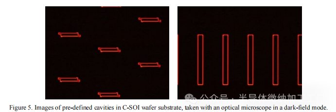图5展示了波导制造开始前腔体-SOI中不同变体的腔体设计。可以看到,尽管腔体已在晶圆基板中定义并且上面覆盖了BOX和SOI层,但在光学显微镜的暗场(DF)模式下,腔体图案的边缘仍然可以清晰地看到。