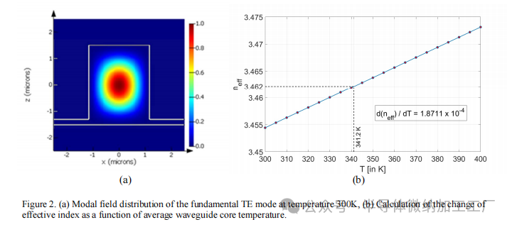 有效折射率变化与平均波导核心温度的关系有效折射率变化作为波导核心平均温度的函数,通过Lumerical模式仿真在二维中计算得出。由于硅的热导率显著高于周围的二氧化硅和空气,因此可以近似认为核心的温度是均匀的。我们将工作波长选定为1.55 µm。1.55 µm波长下,硅的热光系数取为 dn/dT=1.86×10−4在27°C(或300K)时3 µm条形波导的模场如图2(a)所示,计算的有效折射率随波导核心平均温度变化的变化如图2(b)所示。