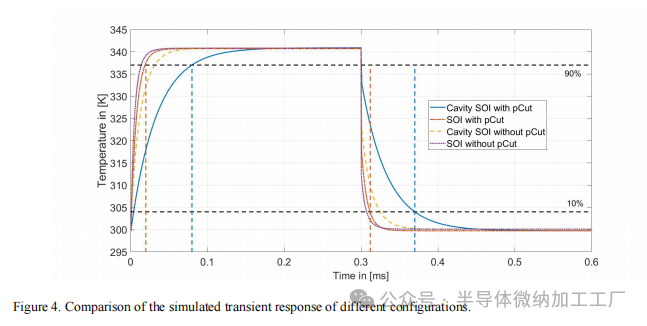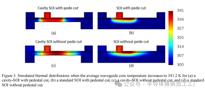 较长的相位调制器需要较小的有效折射率变化,从而需要较小的温度变化,以实现特定的相位变化。然而,对于较长的加热器,要加热的硅体积也会增加。因此,较长的器件并不本质上更具功率效率。然而,对于较长的波导,加热器两端的金属接触处的热漏将按比例减小。在我们对比标准SOI和腔体-SOI时,我们考虑了加热器长度 L=100μm,这使得π相位变化所需的 Δneff=0.0077因此,从图2(b)中的图表,我们可以得到所需的温度变化 ΔT=41.2K,以实现所需的有效折射率变化。在图3(a)-(d)中,我们展示了当波导核心平均温度升高至341.2K时,标准SOI和腔体-SOI平台的热分布比较,分别展示了有无基座切割的情况。在所有仿真中,晶圆底部的温度作为边界条件保持在300K。
