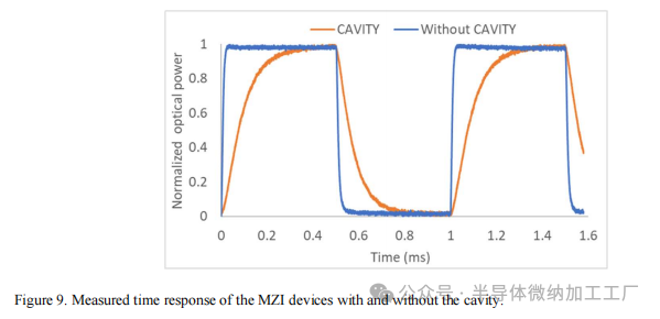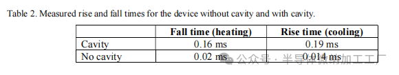 图8.具有腔体的MZI器件的测量传输与加热功率的关系。MZI的性能通过不同的设计参数进行了测试,通过测量有腔体和无腔体的三块不同芯片来确定最佳器件。表2展示了六个测量器件所需的加热功率以实现π相位变化的结果。结果显示,应用腔体时所需的加热功率约为无腔体情况下的10倍。平均而言,在腔体顶部所需的功率仅为2.1 mW,而在没有腔体的器件中则超过20 mW。表2.六个器件的每个π相位变化所需的测量功率和加热器电阻。通过将1 kHz方波信号从脉冲模式发生器应用到加热器,测量了MZI的响应时间。传输通过快速光电探测器测量,并使用示波器记录。信号的幅度选择使其对应于π相位变化。来自具有和不具有腔体的MZI器件的结果如图9所示。观察到,在MZI下方有腔体的情况下,上升时间比没有腔体时慢了14倍,下降时间比没有腔体时慢了8倍(表2)。图9.带腔体和不带腔体的MZI器件的测量时间响应。表2.带腔体和不带腔体的器件的测量上升时间和下降时间。5. 结论