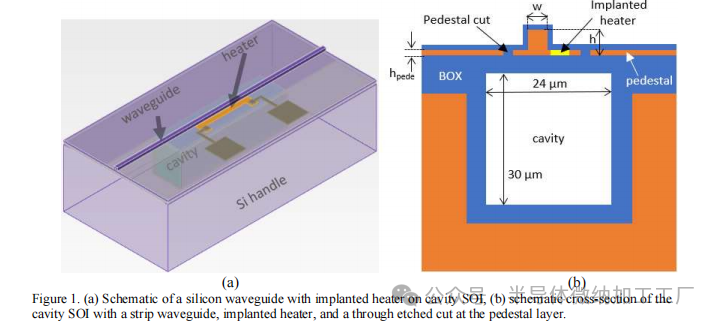 图1. (a) 具有植入加热器的硅波导在腔体SOI上的示意图;