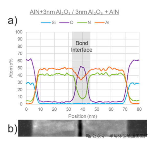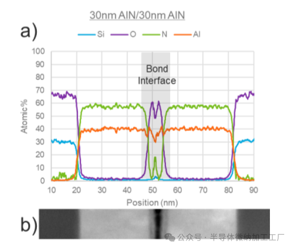 图6. a) 30nm AlN/30nm AlN的TEM-EDX b) 键合界面的HAADF TEM