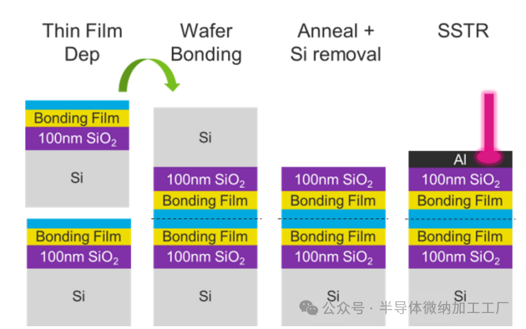 为了测量键合界面上的热导率,晶圆首先进行键合,其中一片硅晶圆被去除以暴露键合薄膜堆叠(见图1)。然后,SSTR技术能够测量整个键合薄膜堆叠的热导率。每一层在键合薄膜堆叠测量之前都通过SSTR和SEM进行单独表征,以减少误差。