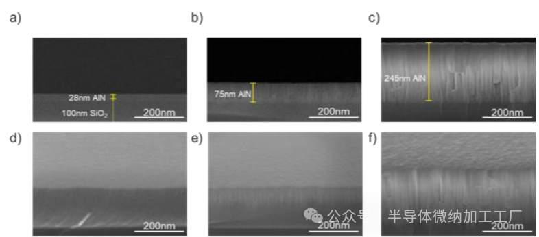 图2 AlN薄膜的横截面SEM(a-c)和表面SEM(d-f),沉积厚度从28nm到245nm不等。