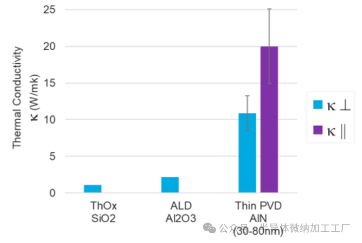 在本研究中,由于30nm AlN薄膜具有较低的表面粗糙度,因此选择该薄膜进行晶圆键合参数的评估。该30nm薄膜的热导率测得为约10 W/mK(跨面)和约20 W/mK(面内)(图4)。该薄膜的热导率低于已报告的数值[3],但仍比传统键合电介质材料高出20倍。虽然该薄膜可以进一步优化以提高结晶度,但它足以用于晶圆键合的评估。